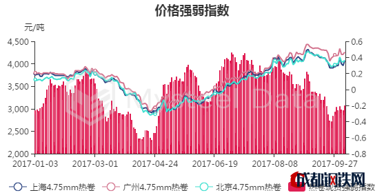 熱卷主力收盤價為4128元/噸,期現(xiàn)基差為32元/噸。期卷1801全天大幅上漲,現(xiàn)4128漲5.98%,縮量增倉。本周熱軋板卷