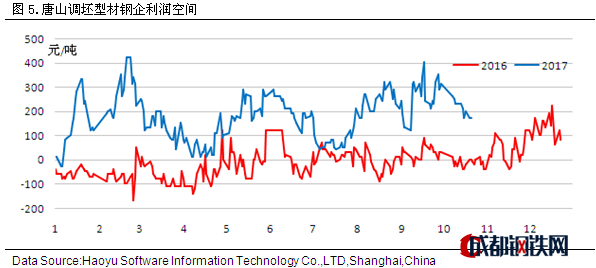 據(jù)2017年10月27日對(duì)上海市場(chǎng)型材倉(cāng)庫(kù)進(jìn)行的同口徑調(diào)查統(tǒng)計(jì)顯示,工角槽庫(kù)存5.05萬(wàn)噸,較上周增加0.16萬(wàn)噸,H型鋼庫(kù)存4.72萬(wàn)噸,較上周增加0.21萬(wàn)噸。 四、鋼廠(chǎng)盈利空間分析