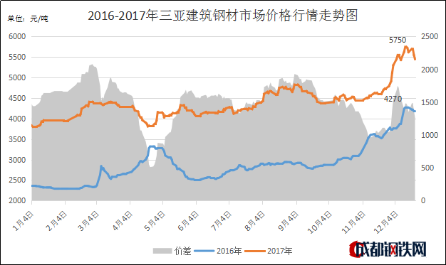 從價(jià)格走勢(shì)來(lái)看,2017年與2016年同樣是前低后高的價(jià)格趨勢(shì),不同的是兩年價(jià)格平均價(jià)差達(dá)1506元/噸。具體來(lái)看,一季度,三亞建筑鋼材市場(chǎng)開(kāi)局漲勢(shì)明顯,兩個(gè)月上漲至4410元/噸,漲幅580元/噸,三月份鋼價(jià)開(kāi)始弱勢(shì)震蕩;二季度開(kāi)始,三亞建筑鋼材市場(chǎng)價(jià)格急速下跌,不過(guò)月余跌至年內(nèi)最低3810元/噸,相較二季度初下跌490元/噸;三季度鋼價(jià)在7-8月份穩(wěn)健上漲至4830元/噸,9月急轉(zhuǎn)而下,跌至4380元/噸;相較三季度初上漲580元/噸;進(jìn)入四季度,在市場(chǎng)均不看好的情況下,鋼價(jià)沖出年內(nèi)新高,12月13日三亞建筑鋼材價(jià)格漲至5750元/噸,月底再次開(kāi)啟快速下行模式,但市場(chǎng)價(jià)格仍處于高位。