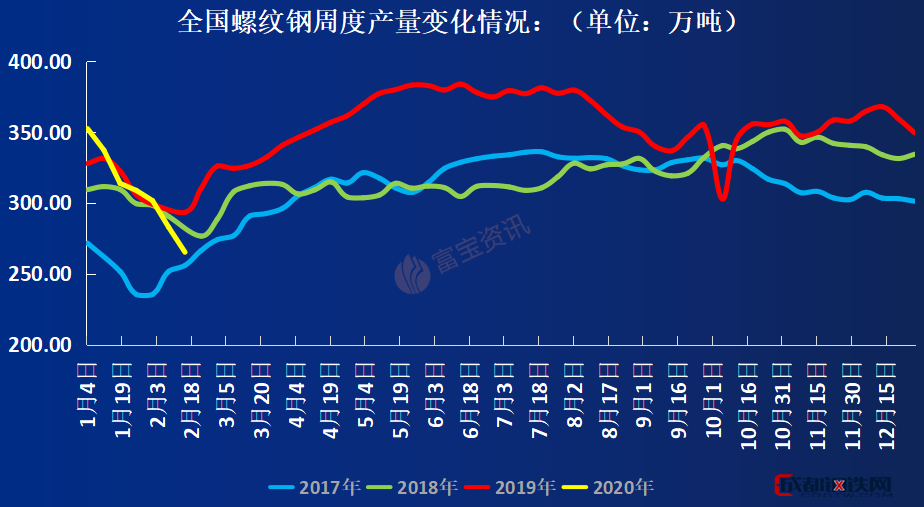 圖4:2017—2020年全國螺紋鋼周度產(chǎn)量變化走勢(shì)圖(單位:萬噸)