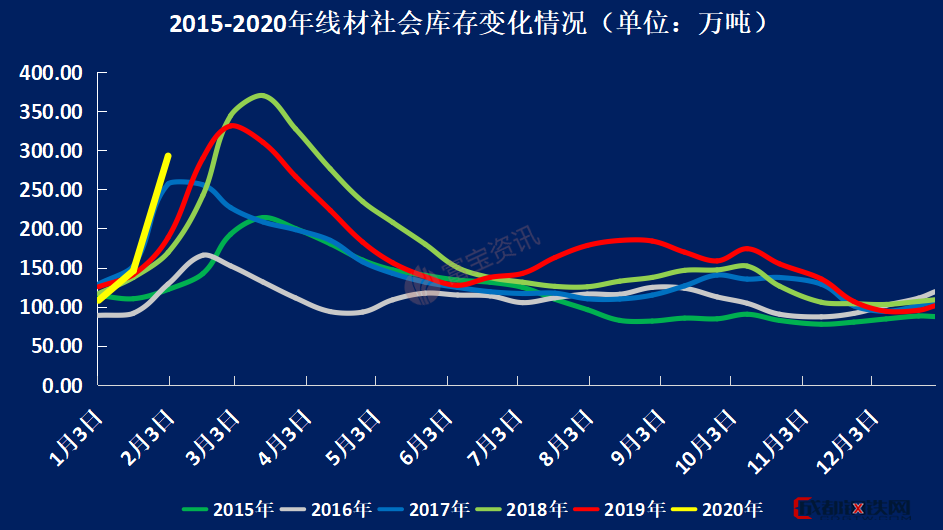 圖2:線材2015年—2020年每周庫存總量走勢(shì)圖(單位:萬噸)