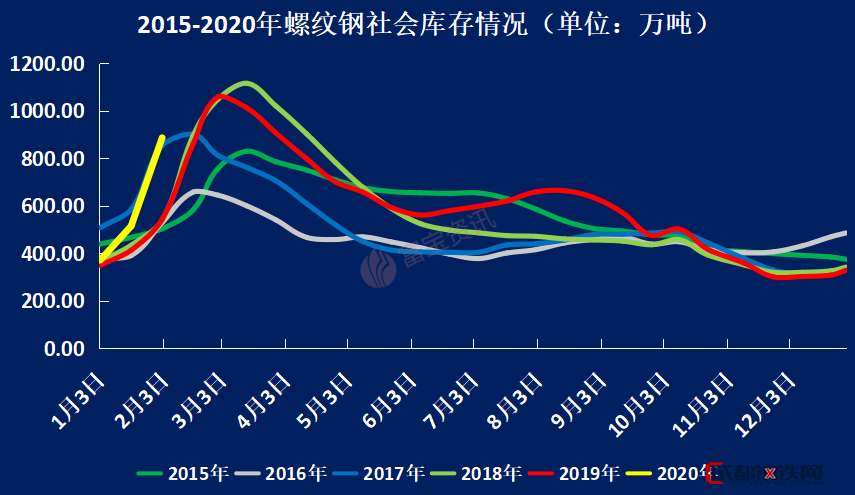 圖1:螺紋鋼2015年—2020年每周庫存總量走勢(shì)圖(單位:萬噸)