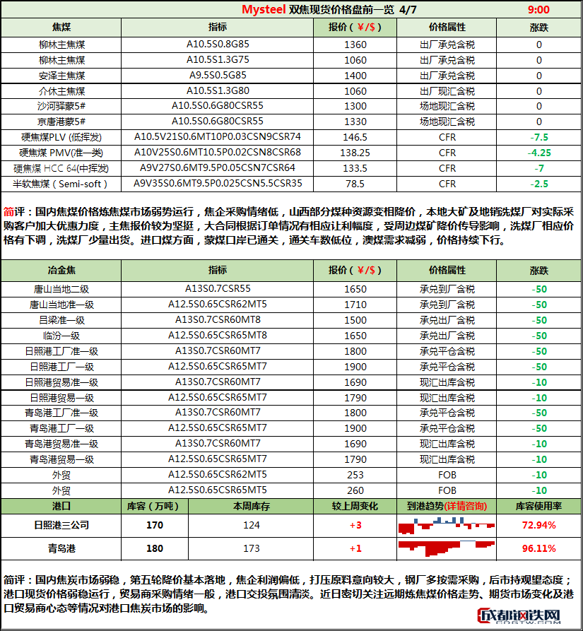7日雙焦現(xiàn)貨交易價盤前一覽