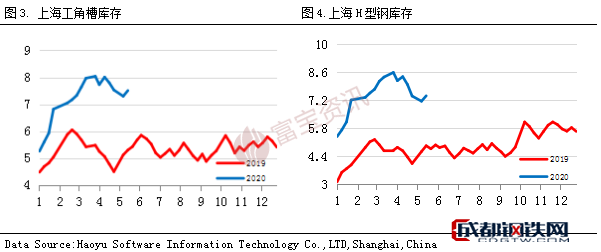 據(jù)2020年4月30日對(duì)上海市場(chǎng)型材倉庫進(jìn)行的同口徑調(diào)查統(tǒng)計(jì)顯示,工角槽庫存7.51萬噸,較上周增加0.21萬噸,